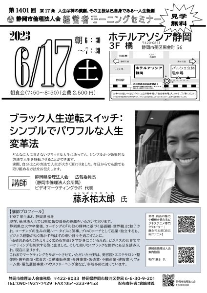 【モーニングセミナー】「ブラック人生逆転スイッチ:シンプルでパワフルな人生変革法」(藤永 祐太郎氏)6/17 開催
